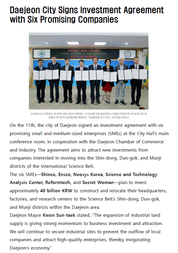 Daejeon City Signs Investment Agreement with Six Promising Companies