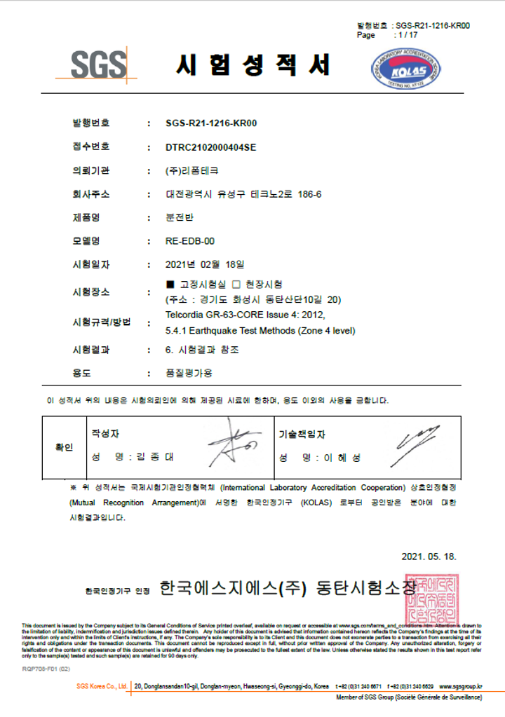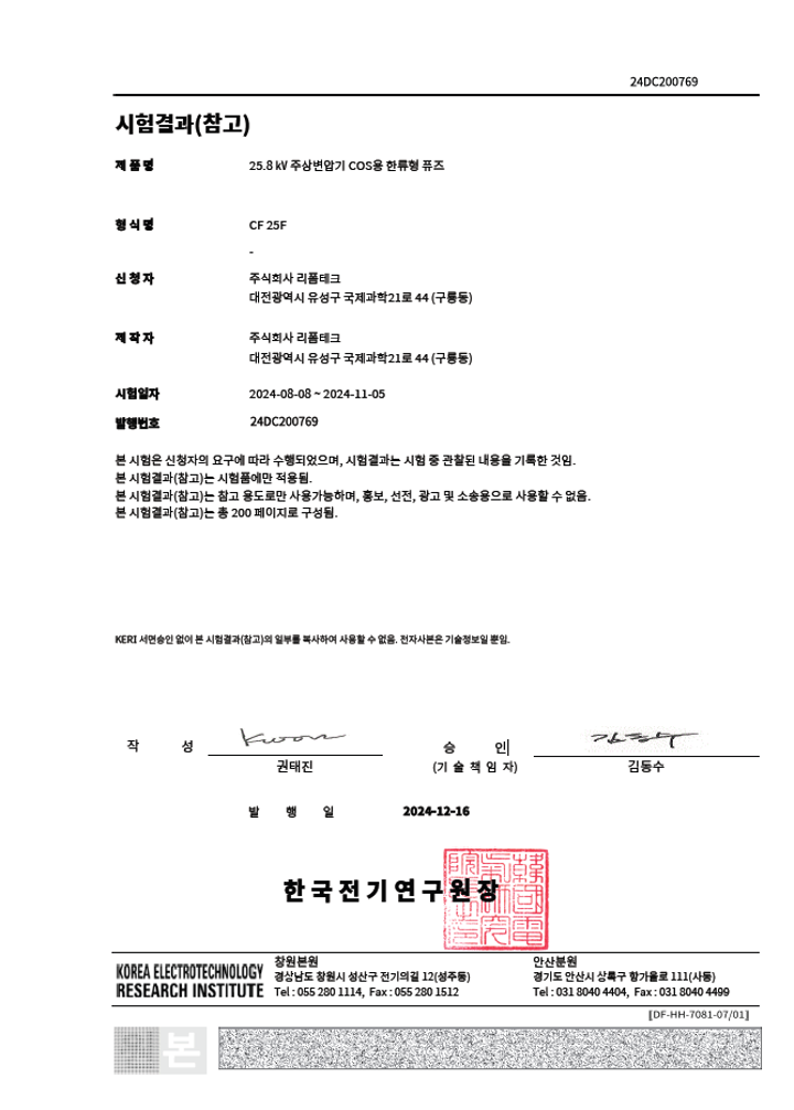 주상변압기 COS용 한류형퓨즈 시험성적서